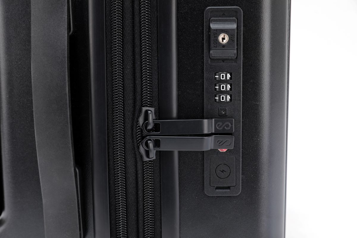 מנעול קומבינציה עם תקן TSA, המקובע למזוודה ונועל גם את תא המחשב הקדמי