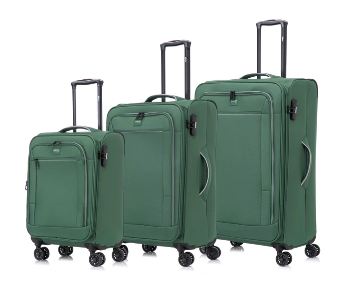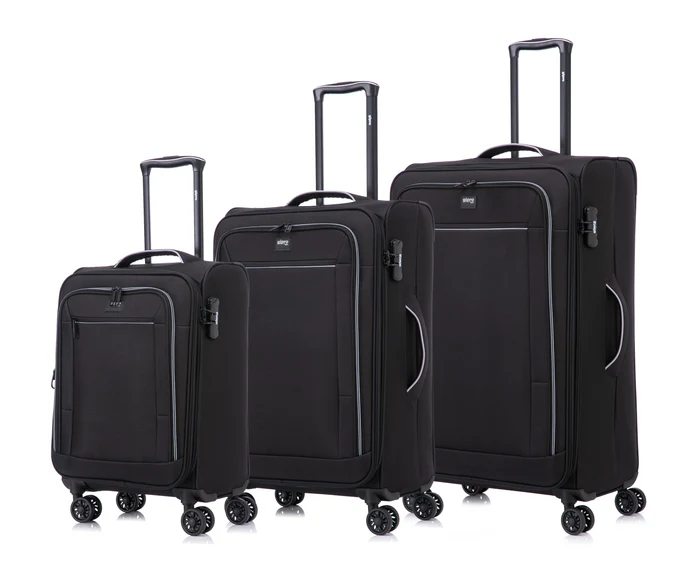 סט 3 מזוודות בד TOKYO: עיצוב נקי, בד פוליאסטר צפוף דוחה מים, הרחבת נפח בכ־20% בכל הגדלים, גלגלים כפולים (8 גלגלים) לנסיעה חלקה, ידית טרולי מתכווננת, 2 כיסים קדמיים ומנעול קומבינציה 3 ספרות. הסט נכנס אחת בתוך השנייה לאחסון בבית. אחריות שנה.