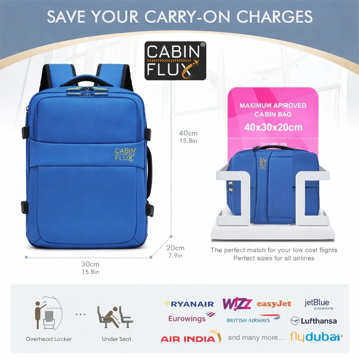 במידות 40x30x20 ס"מ, מתאים לכל חברות התעופה – לואו קוסט ורגילות – ונכנס מתחת למושב ללא תשלום נוסף.