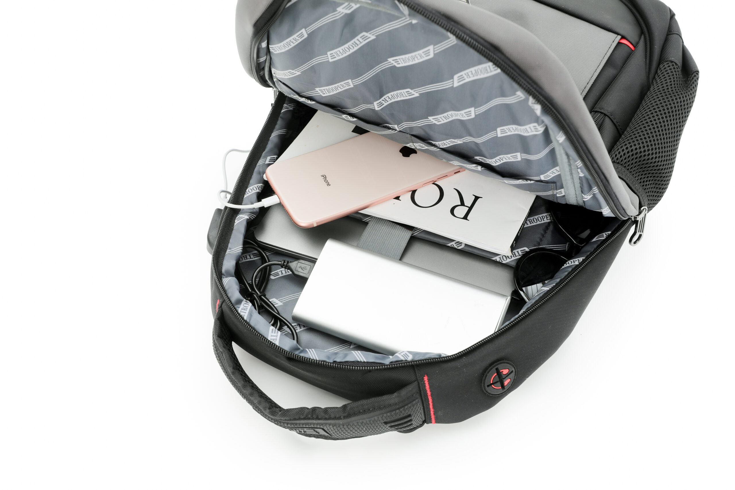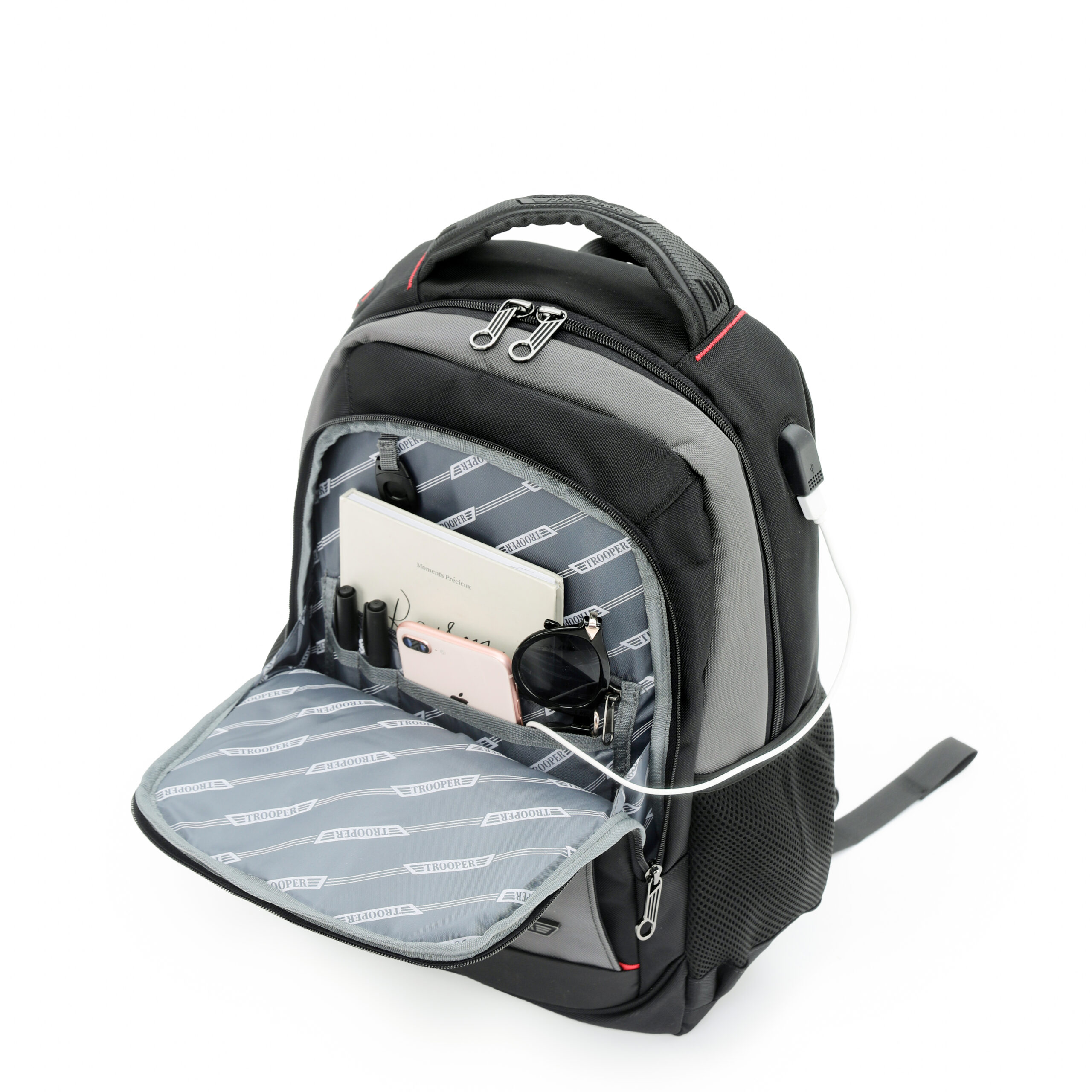 תיק גב חכם וחזק מסדרת התיקים של TROOPER, עשוי פוליאסטר עמיד ובעל תאים רבים לנוחות וארגון מקסימלי. כולל מחבר USB, גב ורצועות מרופדים, רצועת הלבשה על טרולי ונפח של 30 ליטר – מתאים לבית ספר, סטודנטים, חיילים וטיולים.